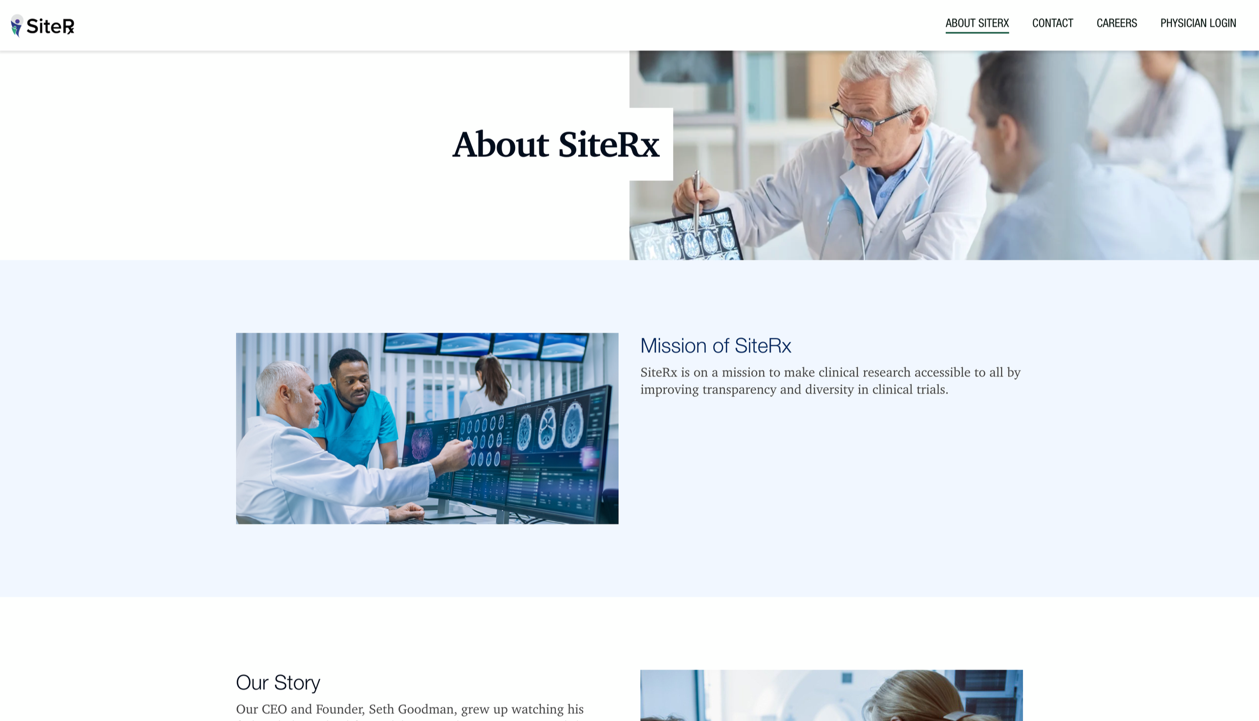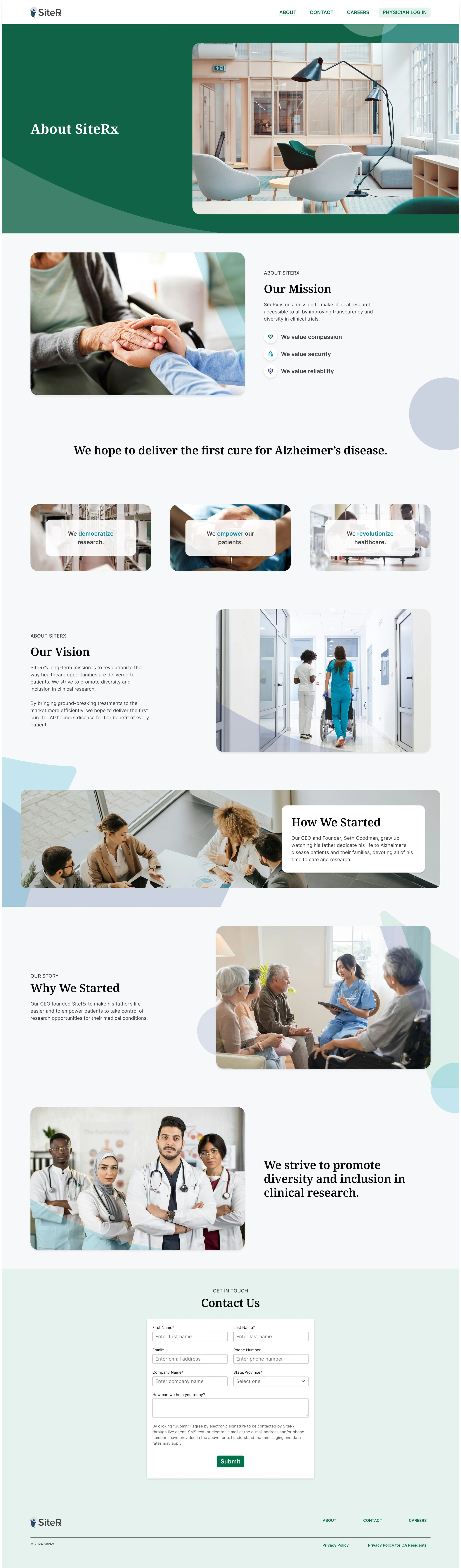 It felt extremely important that the new website’s stock photography lean into the human element of the SiteRx brand. With a modest stock photography budget and a focus on diversity, empathy, and cool toned colors, I ultimately chose a group of images that feel both cohesive and modern.